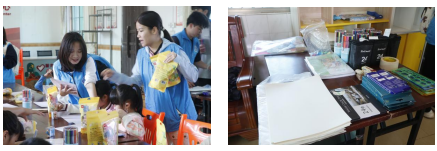 志愿者一早抵达社区进行分工协作,部分同学整理团扇、拓印模板、粘土陶罐等非遗物料,部分同学布置现场、摆放桌椅,为活动打造出独具韵味的传统文化场景。