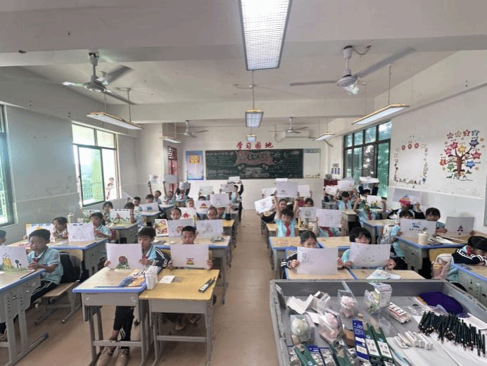 下课铃声响起,孩子们纷纷举起自己的作品:色彩斑斓的小房子、灵动的卡通形象、充满幻想的童话世界,每一幅画都承载着他们天马行空的创意。志愿者们还为孩子们准备了手写祝福卡片,“轻舟快舵,祝你好过春山”“愿你珍惜生命征途,每一天都朝气蓬勃”,一句句温暖的寄语,连同美术作品一起,被孩子们小心翼翼地收进书包。