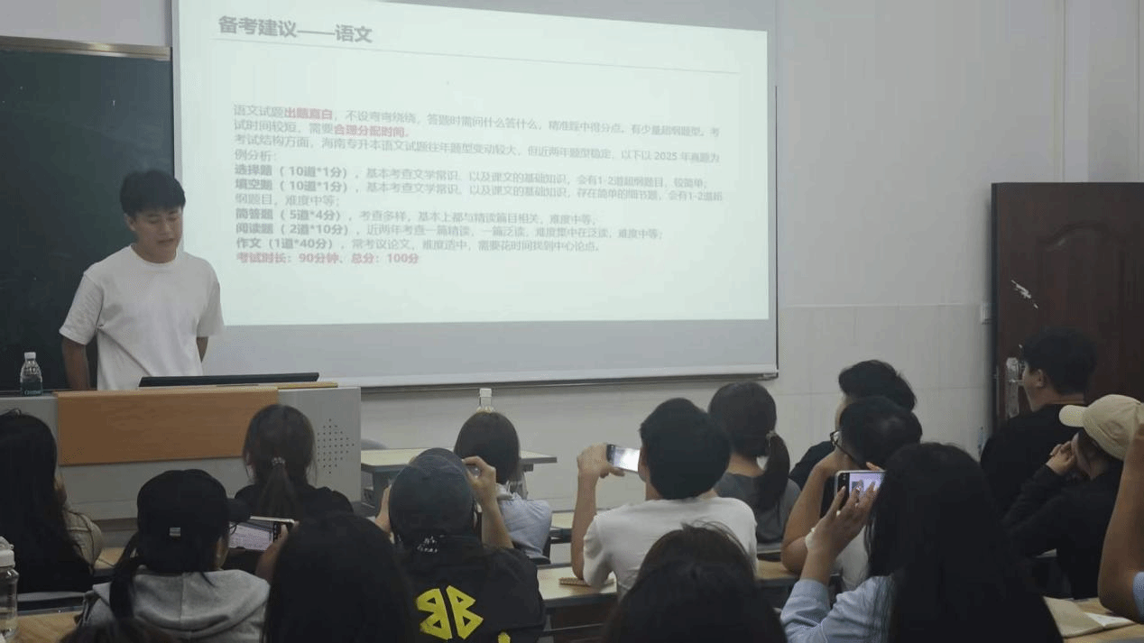 培训伊始,徐超老师围绕海南省专升本核心政策展开系统讲解,从专升本学历含金量、报名时间节点、材料审核要求、考试科目设置、历年分数线与录取趋势等方面逐一梳理,结合艺术类专业特点,明确大学语文、英语、艺术概论等科目的考核重点与分值分布,帮助同学们清晰把握备考方向,提醒大家提前做好规划、严守报考流程。