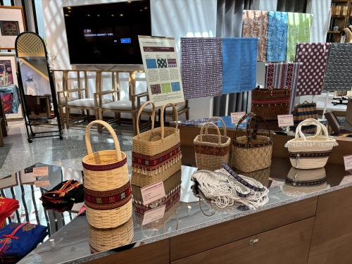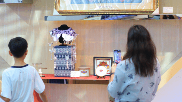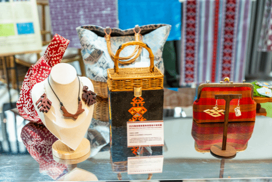 此次参展的服装与配饰作品品类丰富多样,涵盖黎锦元素系列成衣、黎锦双面绣创意首饰、雕刻工艺首饰等多个领域。学生们以“黎族文化及黎锦美学”为灵感源泉,将课堂所学的设计理论、材料运用知识与创新思维深度融合,通过手工精心制作完成每一件作品。其中,21级服装与服饰设计2班的黄冰冰同学带来的《暮山似梦》系列黎族服饰创意成衣套装,宛如一幅流动的艺术画卷。该作品巧妙地将黎族黎锦染印工艺与现代服饰款式相结合,既保留了传统工艺的独特韵味,又融入了当代潮流元素,传递出黄冰冰同学对传统与现代融合的深刻思考与独特表达。23级服装1班的麦嘉怡同学设计的《黎族双面绣胸针饰品套装》,则是对传统工艺的创新演绎。她以黎族非遗双面绣工艺为基础,巧妙运用珠片、刺绣等装饰技法,将传统与现代完美融合,展现出独特的艺术魅力。