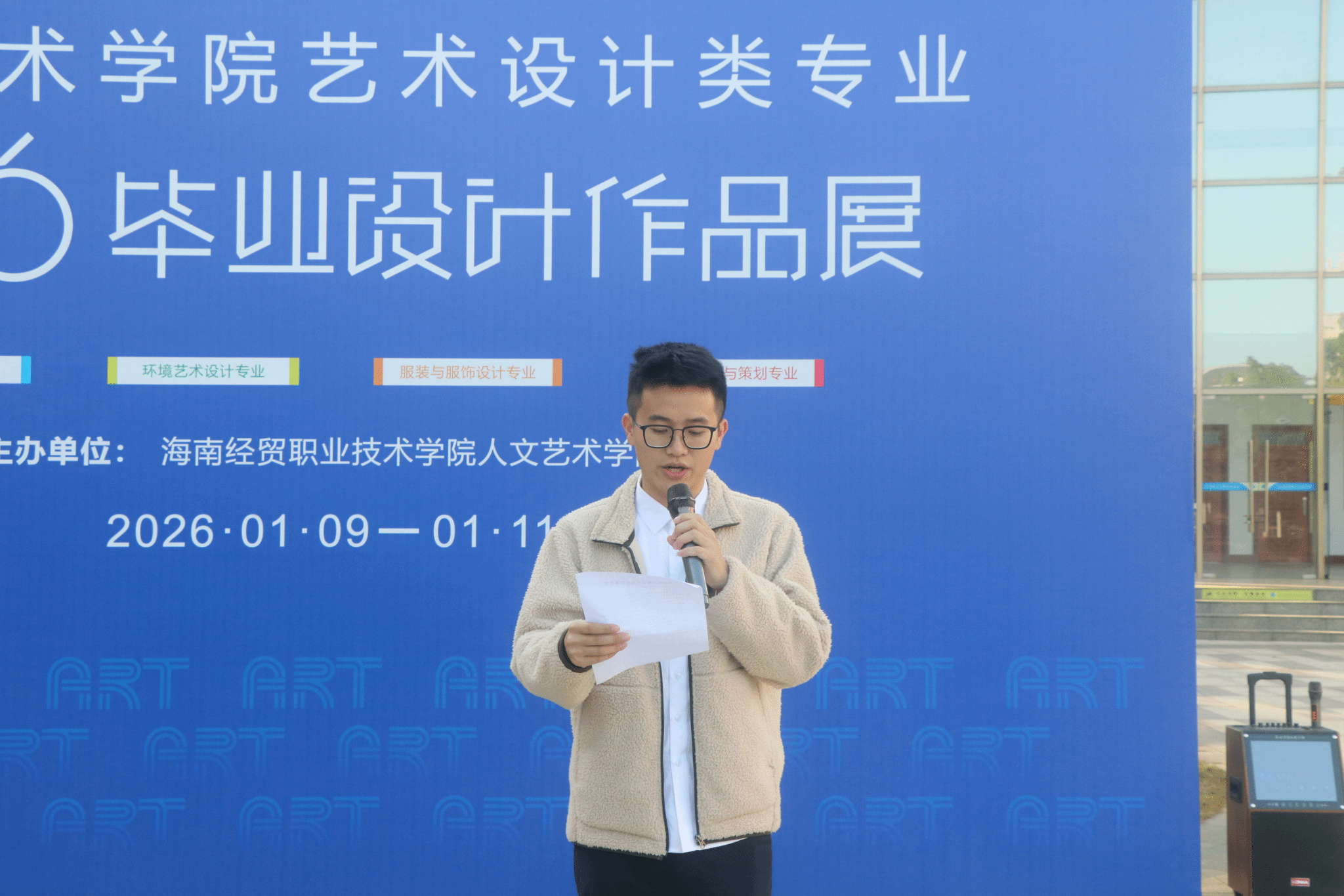 随后,毕业班辅导员符修昊老师深情寄语毕业生,勉励大家不忘初心、持续精进。2026届毕业生代表林良腾回顾了在校期间的学习与创作历程,表达了感恩母校、服务海南自贸港建设的青春志向。