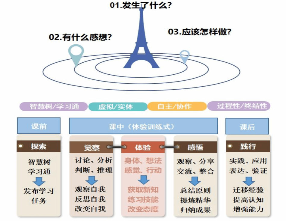 “三阶段”,指的是学生在学习过程中会经历三个问题步骤“发生了什么”“有什么感想”“应该怎样做”。首先让学生自主探索课题相关知识,其次促使学生对学习活动中的行为反思整合,最后通过回顾总结转化为能力提升。