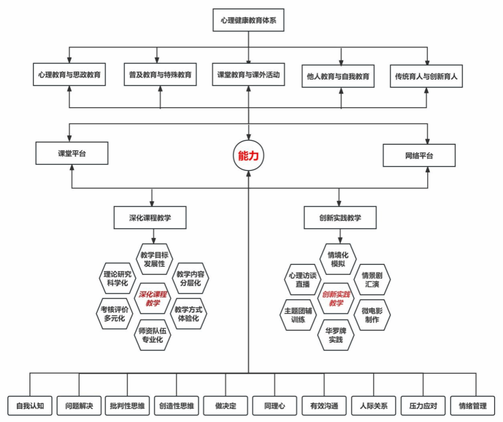 海南经贸职业技术学院切实把心理健康教育纳入到学校德育的顶层设计中,坚持把“育心与育德相统一”这一理念贯穿教学目标、教学方式、教学内容、教学评价各环节。通过全方位、全过程、全员参与的途径,建设了心理教育与思政教育相融合、普及教育与特殊教育相融合、课堂教育与课外活动相融合、自我教育与他人教育相融合、传统育人与创新育人相融合的“五维融合”的立体化课程体系,借助结构化课程知识的有机融合和渗透,更加注重于提升学生的问题解决能力、就业核心竞争力、创新创业能力等。