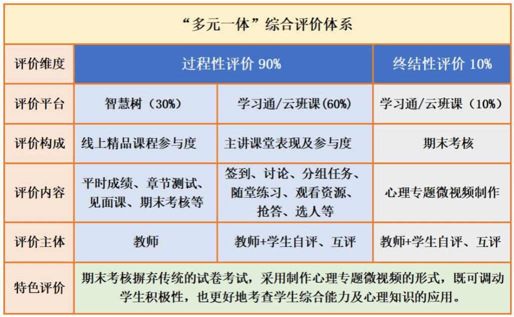 通过评价主体多元化、评价内容多元化、评价方式多样化等,在多元整合中拓展评价维度,构建“多元一体”综合评价体系(图 3)。采用过程性评价与终结性评价相结合,理论知识与综合能力相结合,如期末采用心理专题微视频制作的方式,提升评价考核的科学性和有效性。基于线上、线下相结合的教学模式,以协作学习和自主学习为主,强调学习者的主动性、创造性和积极性,实现了师生间共同学习、共同进步的新型课堂。